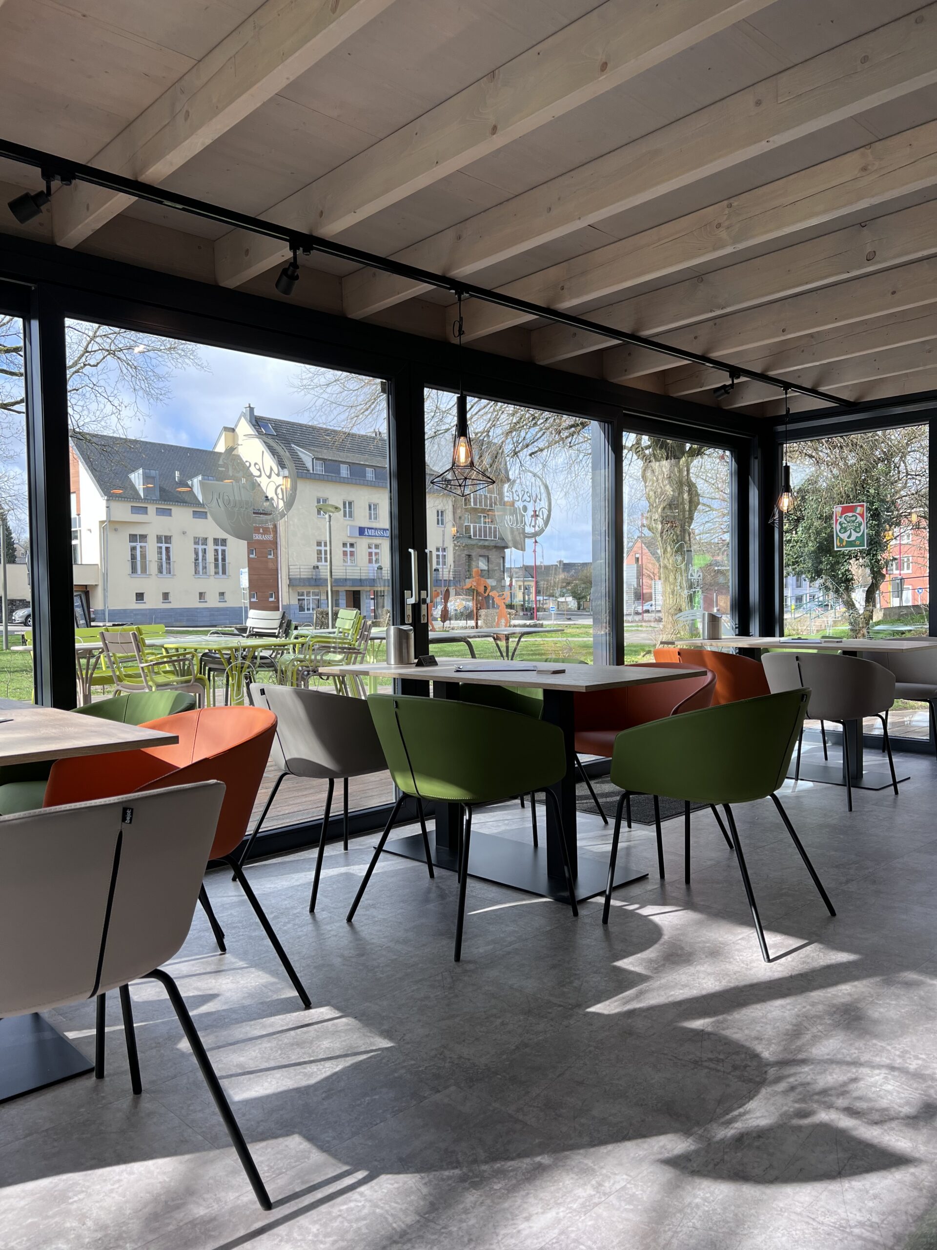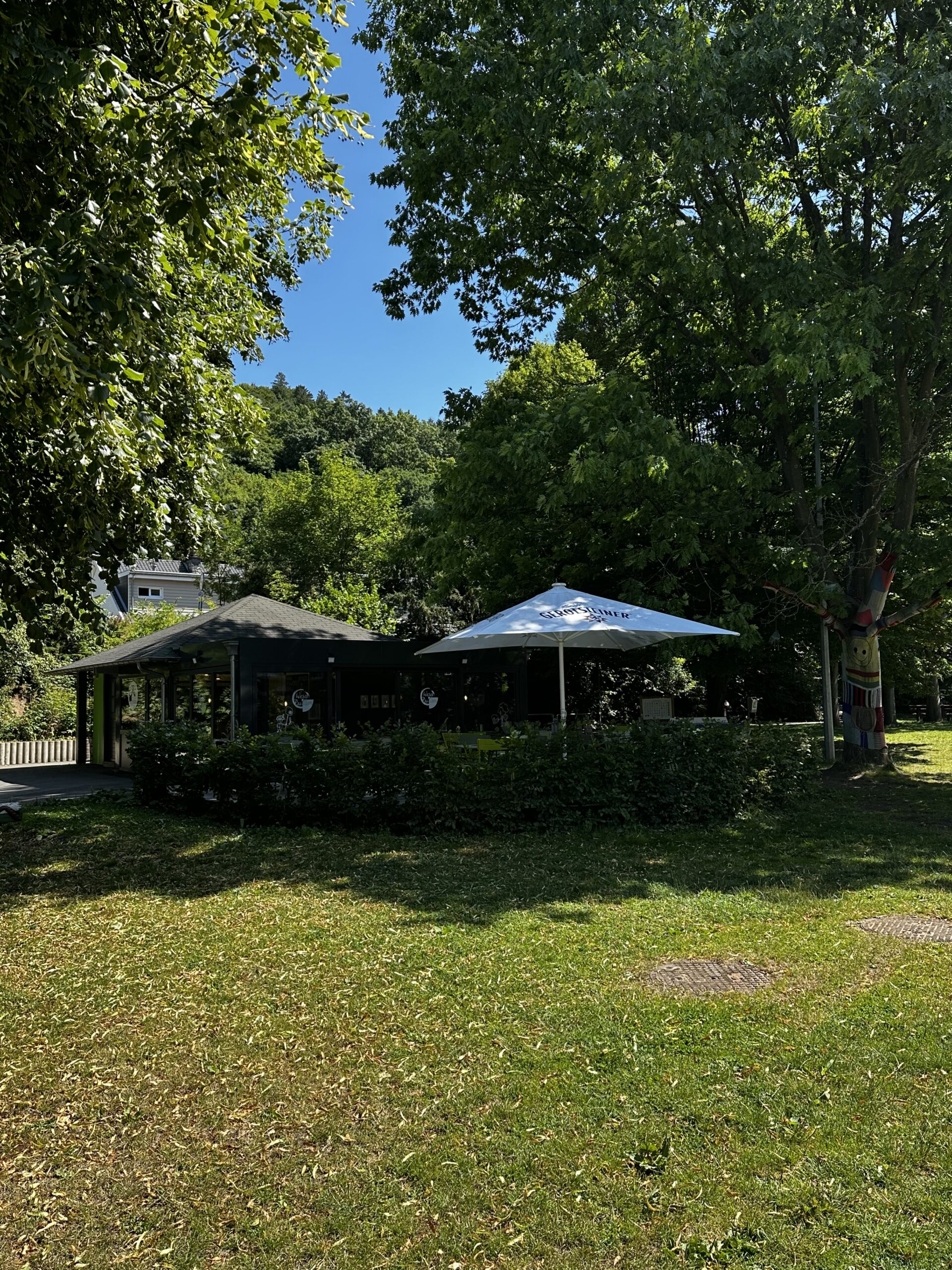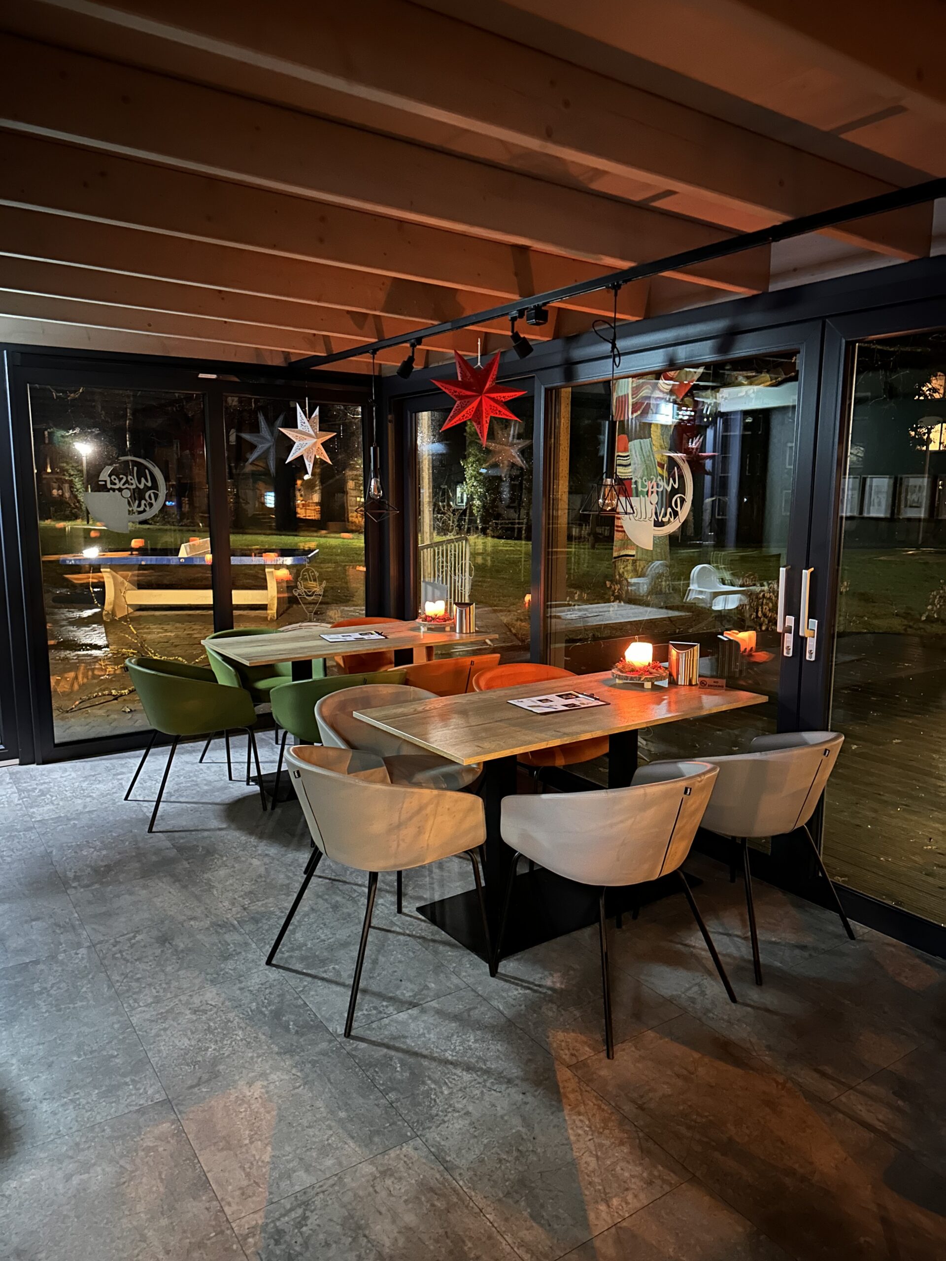 Auf unserer sonnigen Terrasse finden an warmen Tagen etwa 50 Leute Platz. Drinnen wird es im Winter für bis zu 20 Gäste auch gerne etwas eng, aber manchmal hat sowas ja auch einen großen Charme …