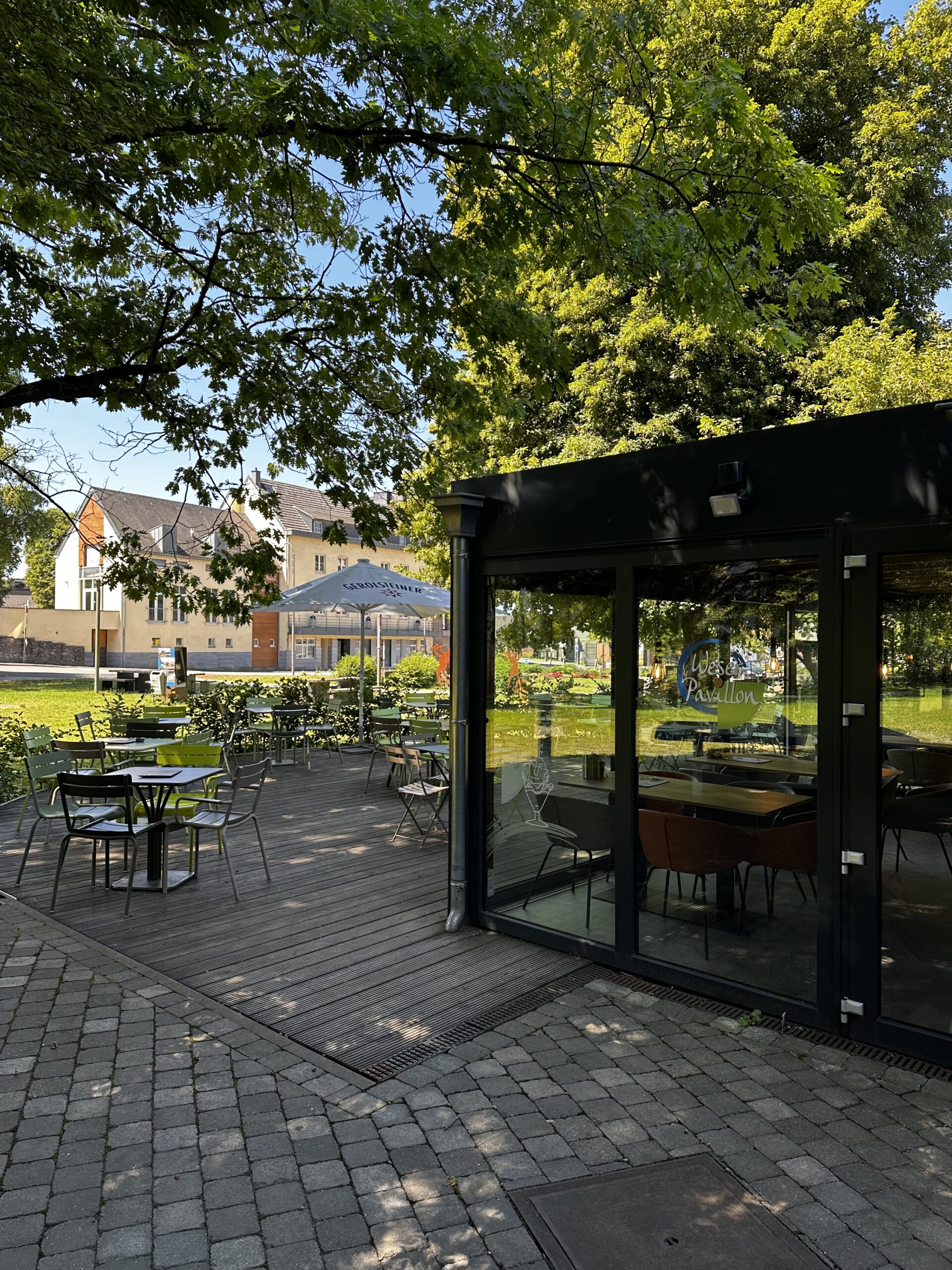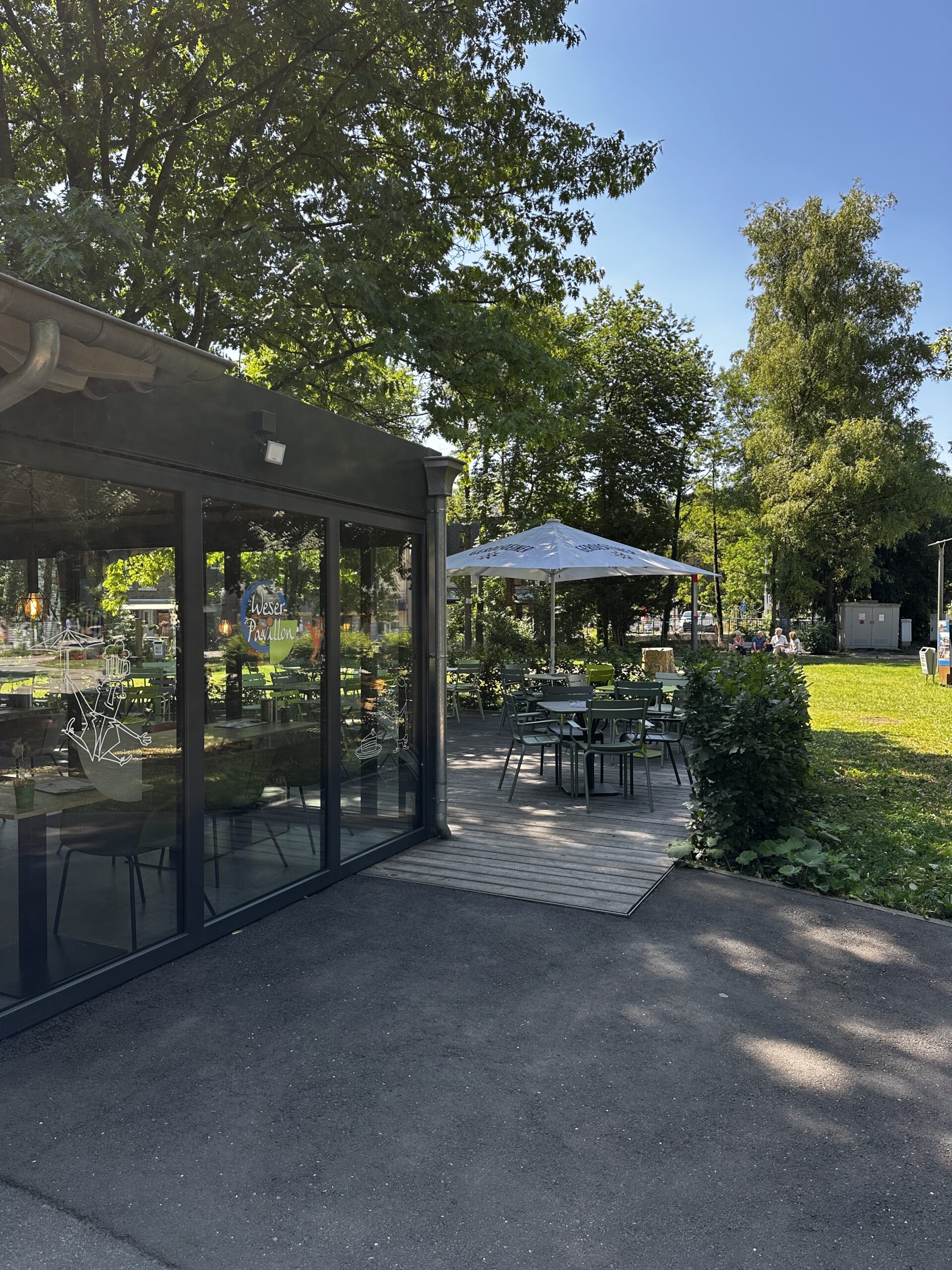 Vom Weser-Pavillon hat man nicht nur eine herrliche Aussicht in den wunderschönen Temsepark, sondern von allen Tischen auch immer den Spielplatz und die Fahrradstellplätze im Blick.